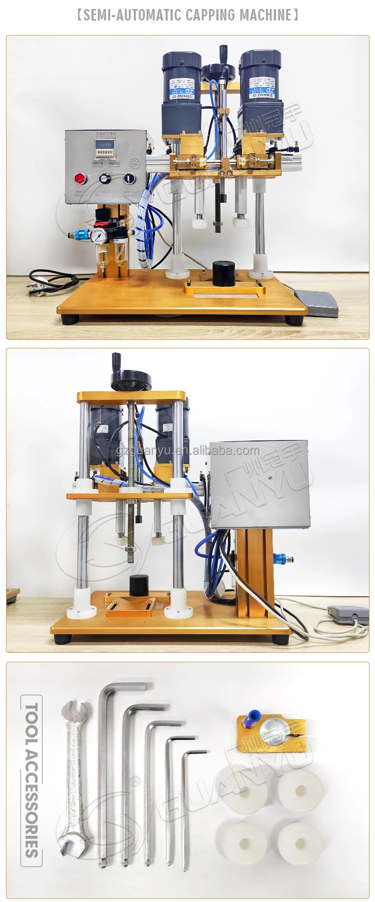 GUANYU Desktop Semi-automatic Twist off Plastic Cap Screwing Machine Pump Head Capper for triggers is suitable for capping various plastic screw caps,spray pump caps, trigger caps; It is widely used in food, Medizin, cosmetic and daily chemicals industries, it can improve the working productivity with high efficiency and reliable performance.