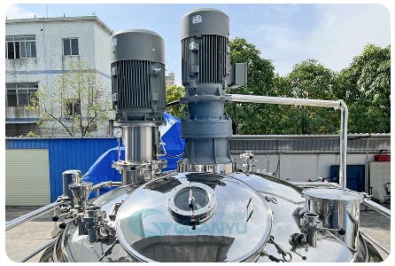 PERFORMANCES AND FEATURES◭The all-round wall scraping mixing adopts the frequency converter for speed adjustment , so that highquality products of different processes according to customer requirements.◭The diversified high-speed homogenizer can powerfully mix solid and liquid raw materials and can rapidly dissolve manyindissoluble materials such as AES , AESA , LSA , etc. during the liquid detergent production process so as to save energy consumpionand shorten production period.◭The pot body is welded by imported three-layer stainless steel plate. The tank body and the pipes adopt mittor polishing , whichfully conforms to GMP requirements.◭According to customer requirement , the tank can heat and cool materials. The heating way including steam heating and electricheating. Easy to discharge , bottom direct discharge or by transfer pump.