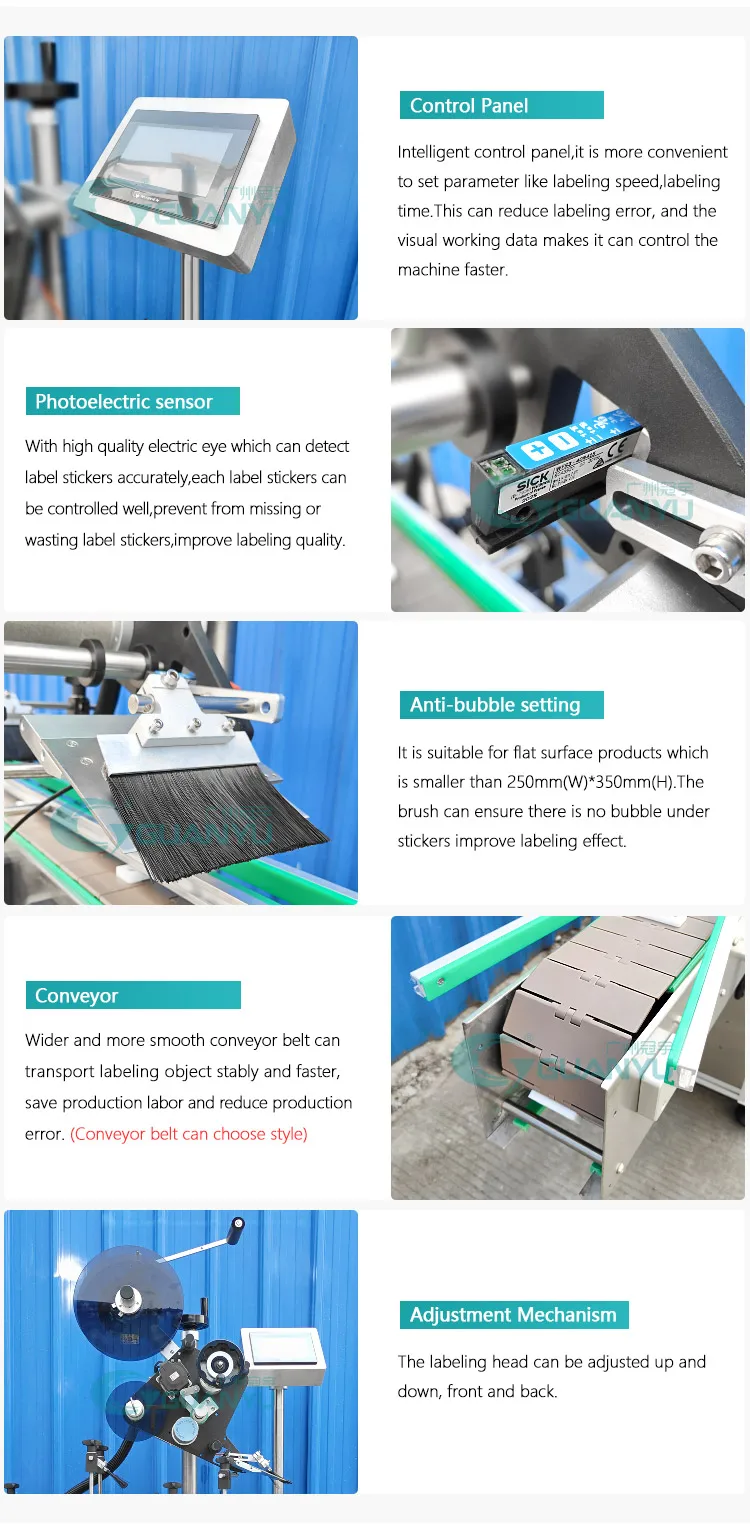 1. Todas as máquinas de rotulagem são feitas de aço inoxidável SUS304 2. Máquina de rotulagem pode ser equipada mesa de alimentação de garrafa 3. Máquina de rotulagem Evite muitos problemas de rotulagem de trabalho, Rotulagem inclinada, bolha, ruga, rotulagem irregular etc. 4. A máquina de rotulagem equipa o olho elétrico para melhorar a precisão para cortar os materiais da etiqueta. 5. Máquina de rotulagem adota plc equivalente, Módulo de posicionamento, Controle do sistema de controle elétrico do motor e sensor de passo e sensor.